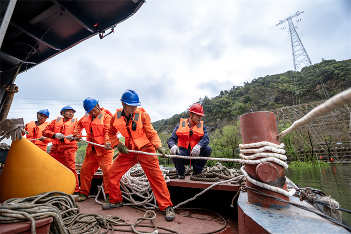 为此建设团队以数智化技术破局,前期通过无人机、先进的RTK数智定位技术,精准规划跨江路线,避开生态保护区和强横风区域。 当天采用动力拖船+无人机“接力”展放导引绳,并搭配“张力放线”的方式,最大限度减少导线摆动,既保障了施工安全,又最大限度减少对航运的影响。 同时,本次跨越施工全程践行绿色建造理念,提前制定专项方案,优化大型器械摆放位置,减少林地砍伐,后续还将通过撒播草籽等方式全面恢复植被,实现工程建设与绿水青山和谐共生。