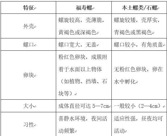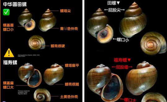【这些危害要知道】 福寿螺看似普通田螺,实际是“生态杀手”,属于外来入侵生物之一。 1.危害植物生长 福寿螺以植物为食,会啃咬植物的根部和叶子,导致植物的生长受到限制。 2.破坏生态平衡 福寿螺在我国的天敌非常少,加之福寿螺的生命力极强且繁殖速度快,本土物种很难与福寿螺竞争生存空间,会严重破坏水生生物的多样性。 3、传播寄生虫病 据统计,一只福寿螺中含寄生虫少的有3000条、多的达6000条,包括血吸虫、肺吸虫、管圆线虫等,生食或食用未煮熟的福寿螺极易感染寄生虫病,严重时可导致死亡。 【如何分辨福寿螺】 现螺蛳、田螺已上市,为防止大家认错误食,下面这份小贴士送给大家。