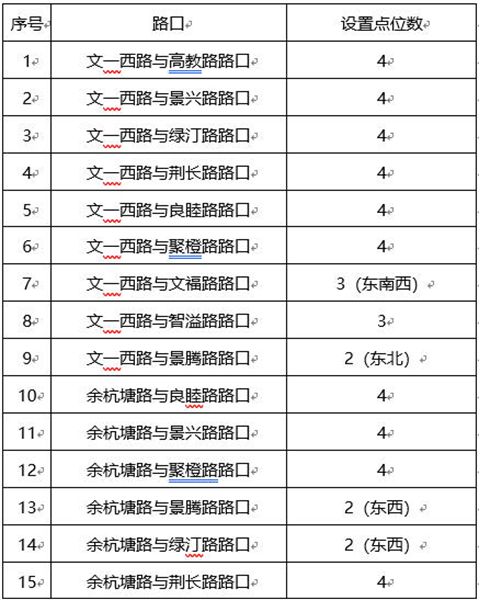 余杭区 余杭区按照功能优先、安全美观的原则,通过实地踏勘并结合2025年市民群众意见反馈,计划于5月底在文一西路、余杭塘路等主要路口设置安装52顶非机动车道遮阳棚。市民朋友如有相关意见建议,可致电89516547反映。 余杭区非机动车道遮阳棚安装点位清单